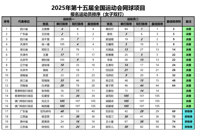 据中国网球协会官方音讯,郑钦文报名投入第十五届全运会经验赛女单比赛,搭档尤晓迪出战女双比赛。