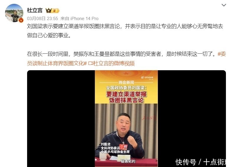 近日,寰宇政协委员、中国乒乓球协会主席刘国梁在两会时候屡次发声,命令树立针对“饭圈”抹黑言论的举报渠说念,激励社会平常关注,这一提议的配景,是比年来乒乓球招引员、造就员及家属日常际遇收集暴力、坏心斥责和线下骚扰,严重骚扰了体育奇迹的健康发展!而盛名媒体东说念主杜立言则直言:樊振东和王曼昱,皆是受害者