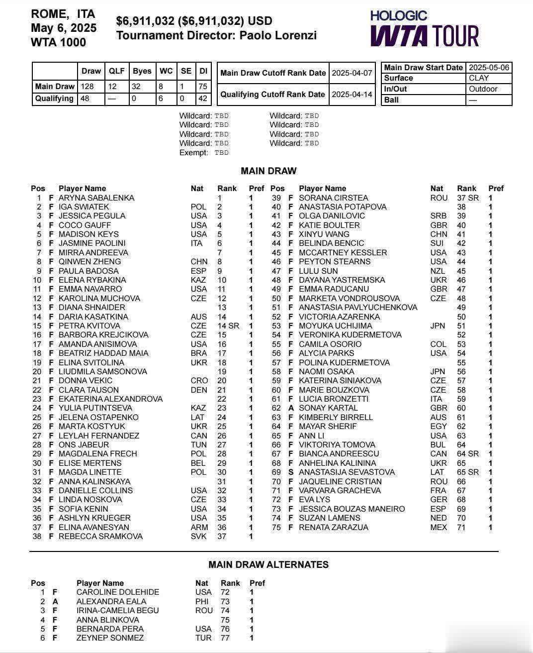 2025年WTA1000赛罗马站公布了参赛名单体育录像/图片,宇宙名秩序一的白俄罗斯名将萨巴伦卡领衔出战本赛季的第二项红土顶级赛事。从报名情况来看,宇宙前十全员出战,中国金花郑钦文将以8号种子的身份联袂王欣瑜亮相罗马赛事。