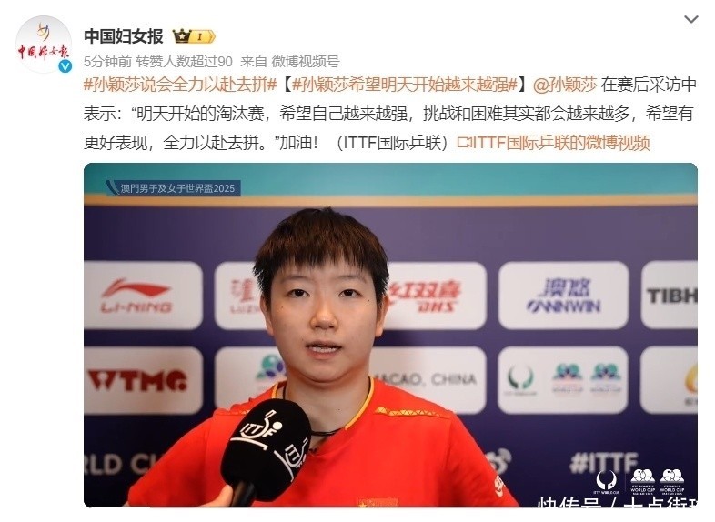 北京时辰4月16日,澳门乒乓球寰宇杯迎来女子单打小组赛第三日的较量,国乒“小魔王”孙颖莎以3-1打败中国台北选手书彤娟体育录像/图片,以两战全胜的战绩强势晋级16强,赛后,孙颖莎在接管采访时直言:“未来运转的淘汰赛,但愿我方越来越强,挑战和勤恳其实都会越来越多,但愿有更好默契,负重致远去拼!”这番宣言不仅展现了她的决心,也让外界对这位寰宇第一的竞技景色充满期待