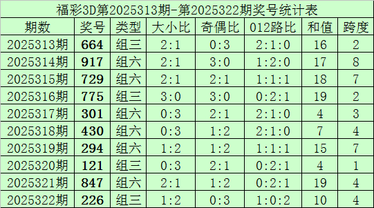 开奖总结:福彩3D第2025322期奖号为226,其中奖号大小比为1:2,奇偶比为0:3,012路比为1:0:2,和值为10,跨度为4。